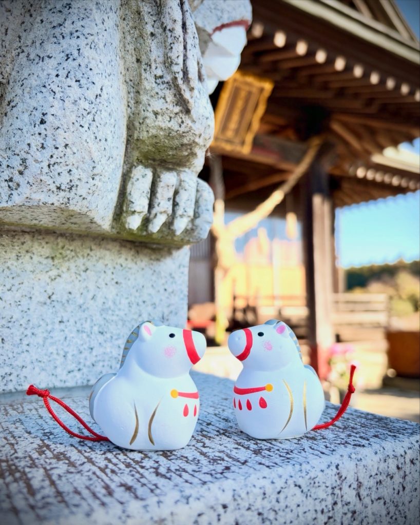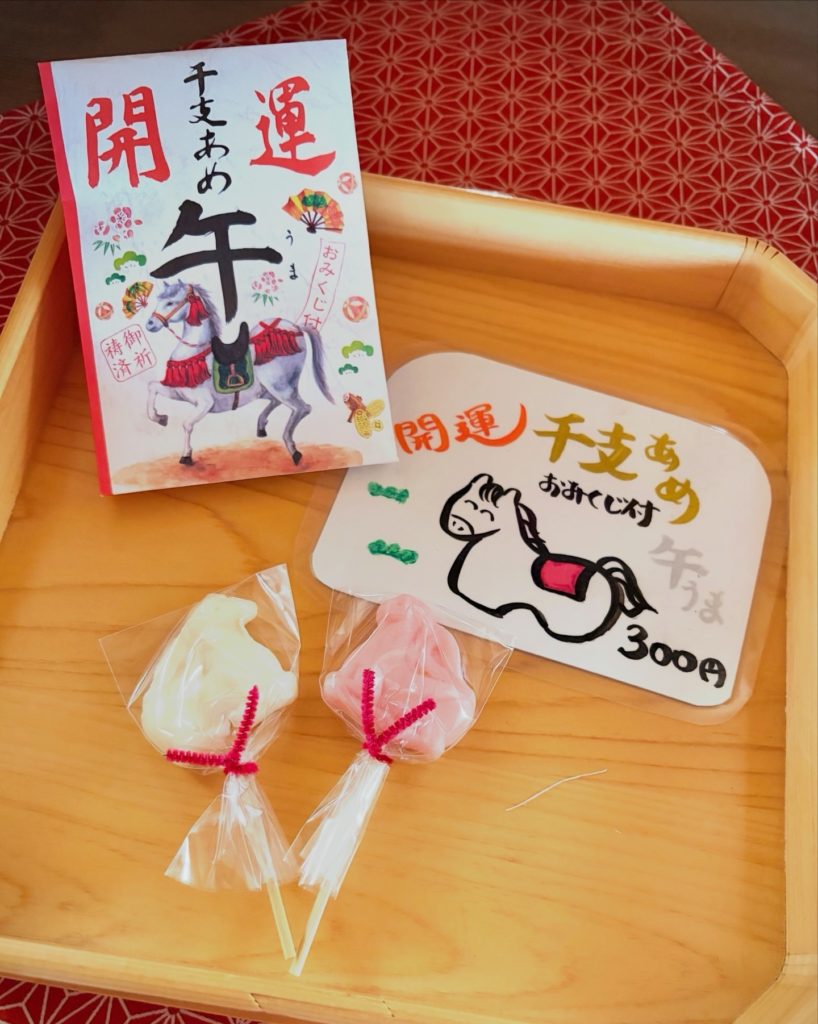 ・だるま・熊手・破魔矢・鏑矢・丸絵馬・ミニ絵馬・日本の神様みくじ(吉凶無)・干支みくじ・干支飴・御神酒・天照塩・ふるさと万年茶等